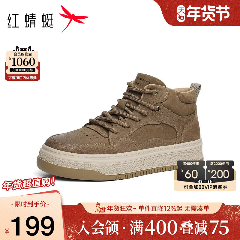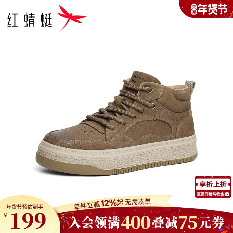 红蜻蜓休闲工装板鞋秋冬新款男鞋平底系带高帮鞋通勤小白板鞋皮鞋