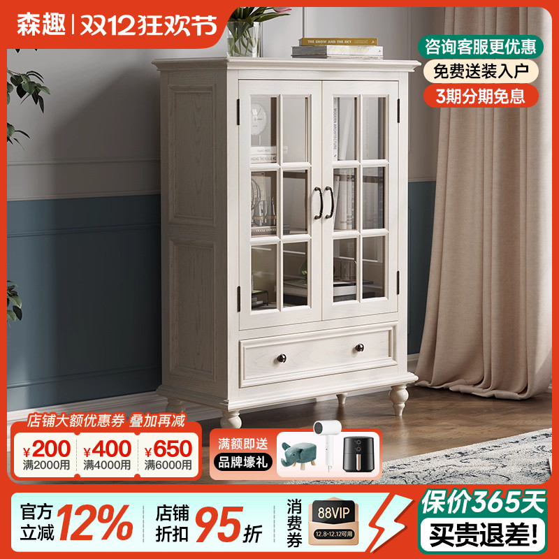 森趣美式乡村实木酒柜 简美风格简约小号矮酒柜 3C钢化玻璃餐边柜