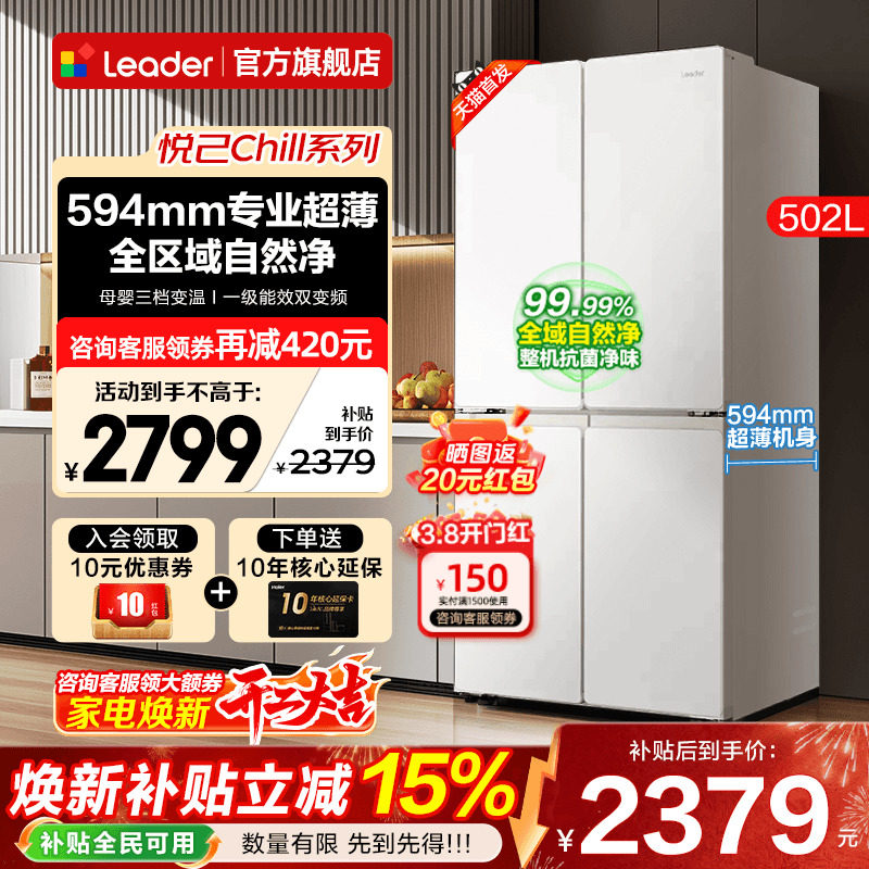 海尔冰箱502升白色Leader十字四开对门超薄一级能效家用电旗舰店