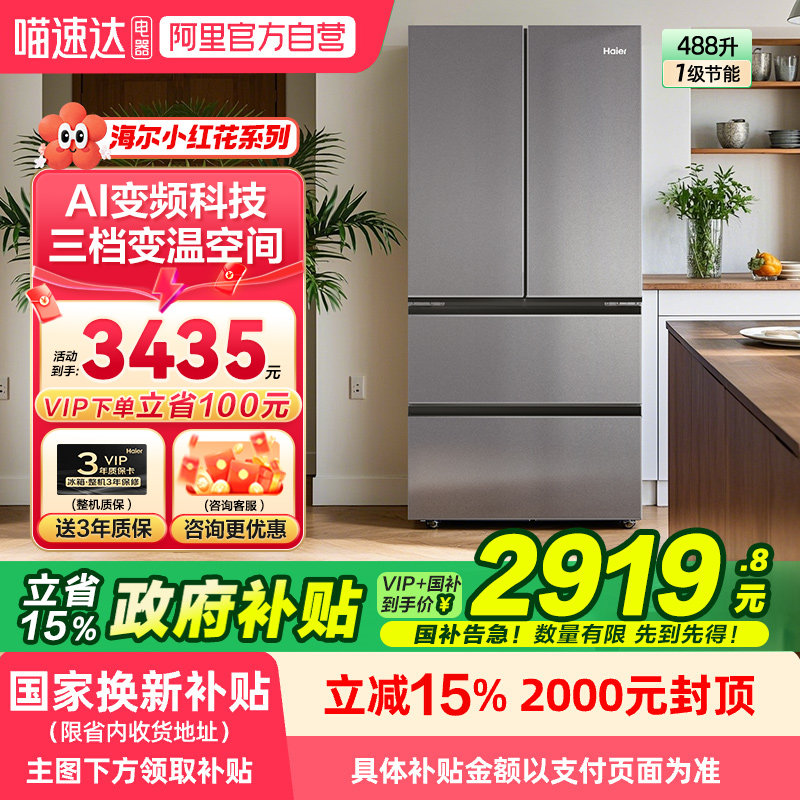政府补贴海尔冰箱488L法式对门超薄一级能效风冷无霜小红花套系78