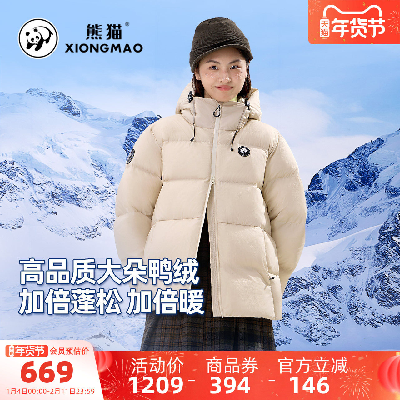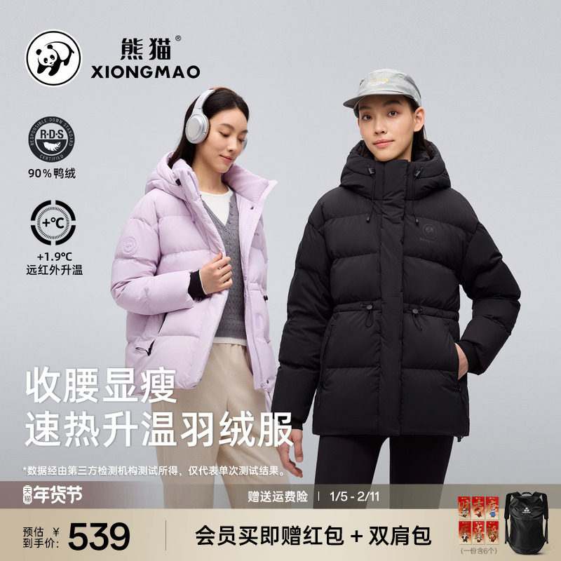 熊猫户外羽绒服女2025新款冬季保暖鸭绒宽松收腰显瘦速热外套