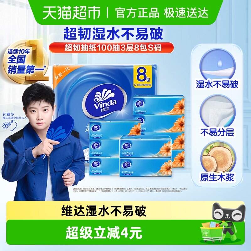 维达超韧抽纸100抽3层8包S码抽取式纸面巾家用 超韧湿水不易破
