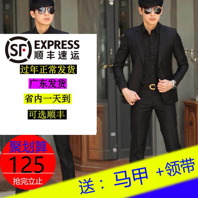 特价春装韩版修身西服套装男青年学生新郎西装两件套宝蓝色职业装
