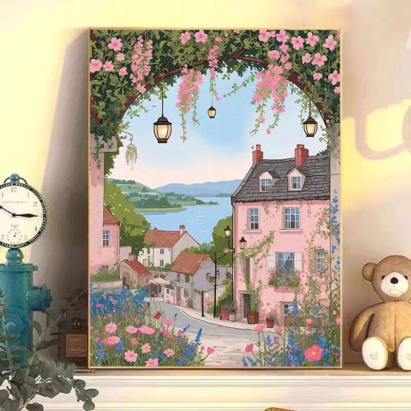 粉色城市海边宫崎骏风格客厅装饰画治愈系风景餐厅咖啡厅氛围挂画