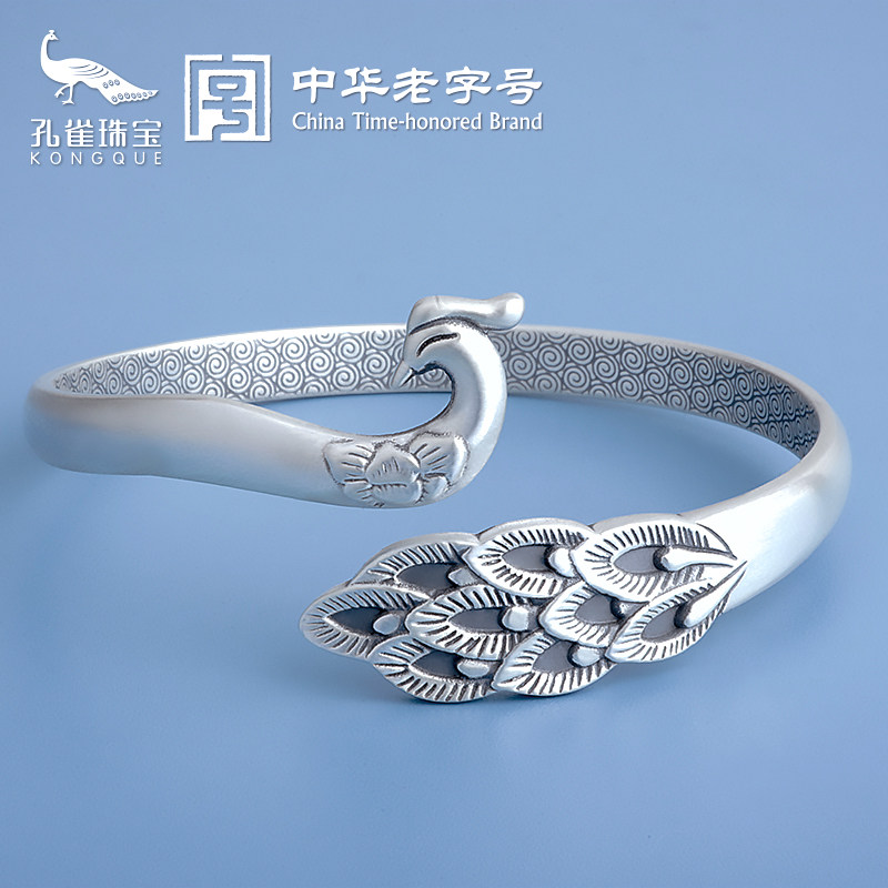 孔雀古风银手镯足银女9999银镯子开口足银实心银手饰手环雪花银