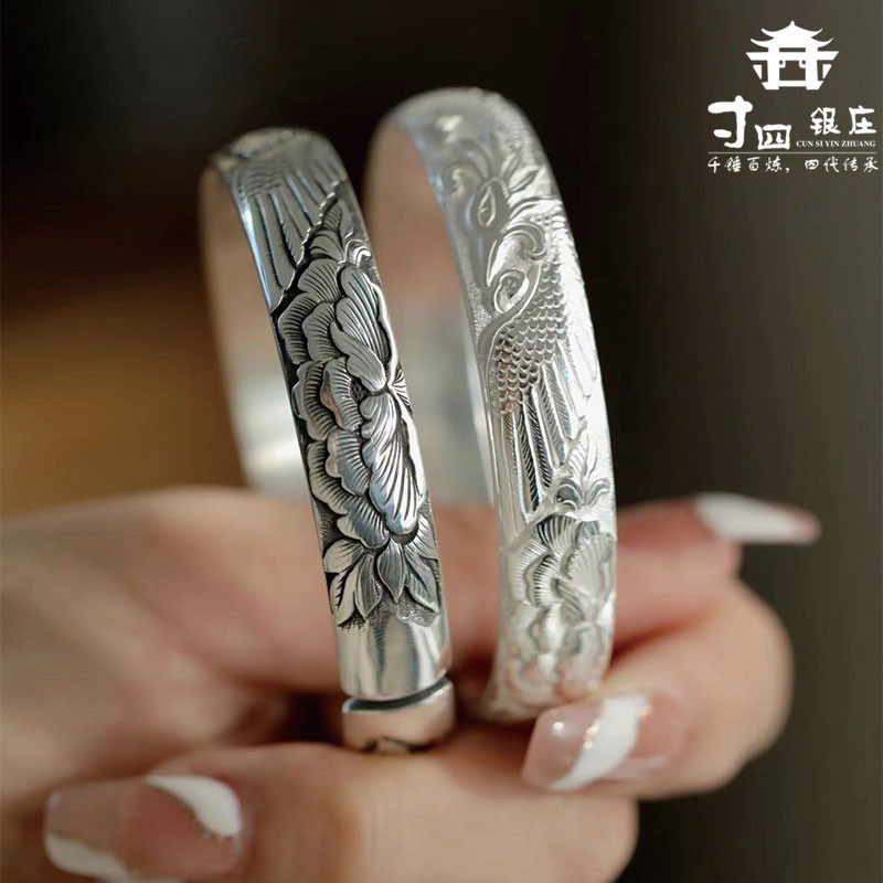 大理寸四银庄银手镯 999足银雪花银开口手工纯银镯子凤穿牡丹饰品