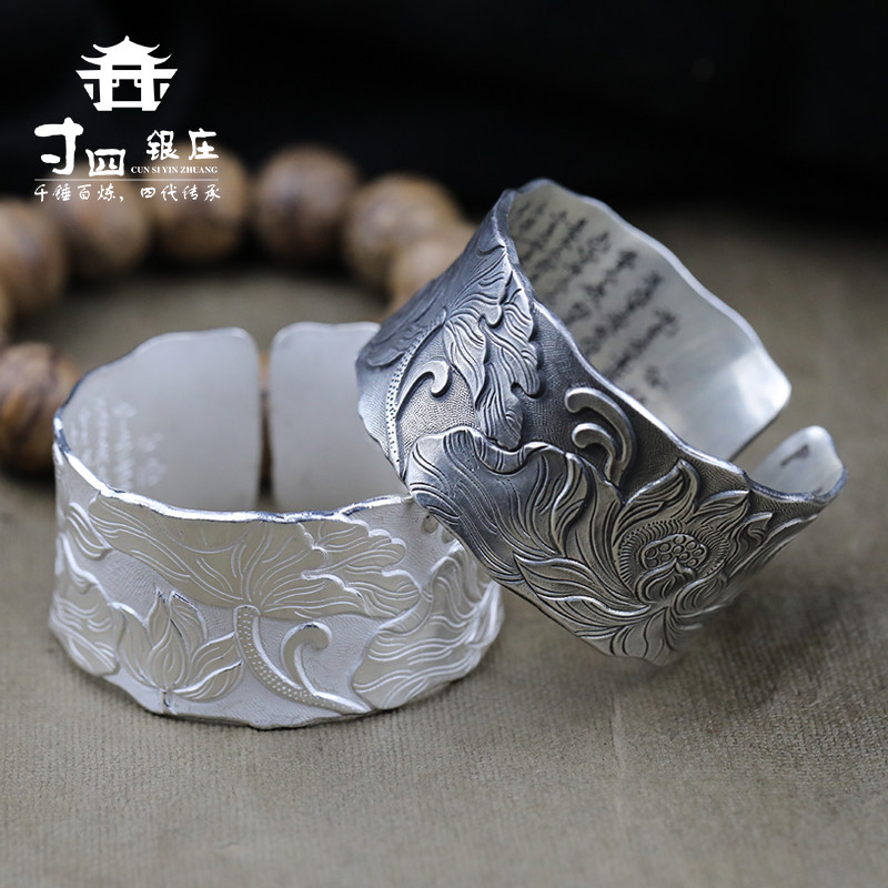 荷花手镯手工心经手镯浮雕莲花手镯999足银雪花银纯银手镯子复古