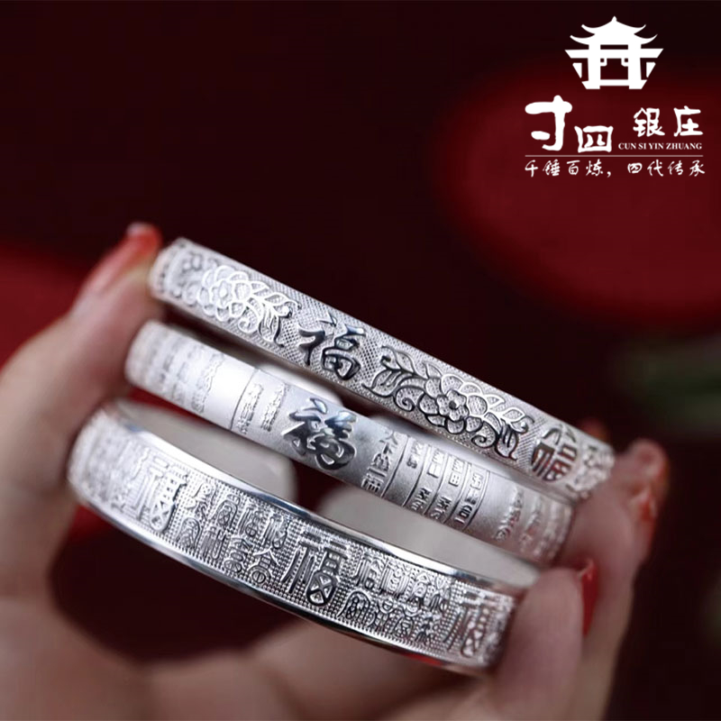 大理寸四银庄银手镯999足银百福 送妈妈雪花银纯银手镯伴手礼饰品