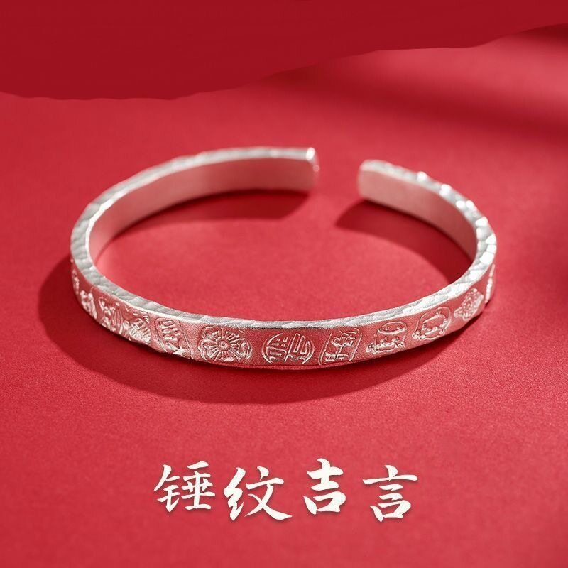 定制锤纹足银纯手工S999雪花银手镯足银镯子吉言国潮情侣款手环