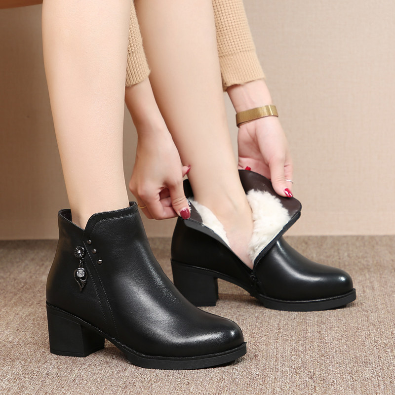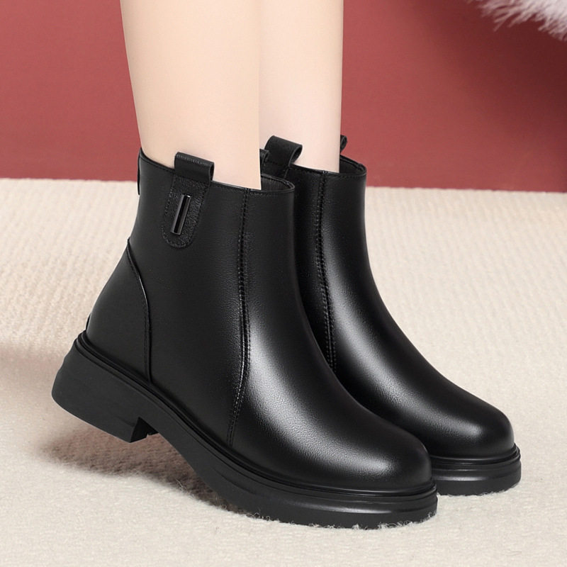 妈妈短靴真皮中年单靴中老年女士棉鞋防滑秋冬新款棉皮鞋黑色洋气
