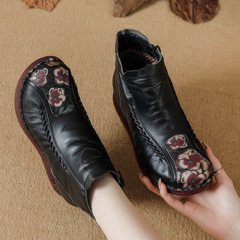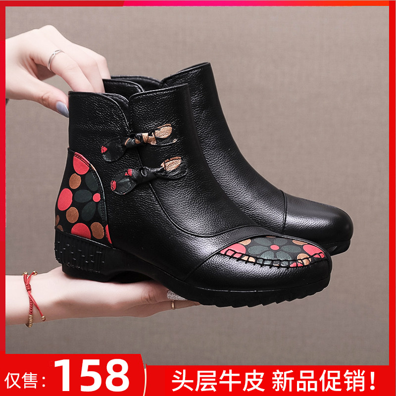 高档原创手牛工女皮靴印花复古中国风女鞋中粗软跟底妈妈短靴真皮