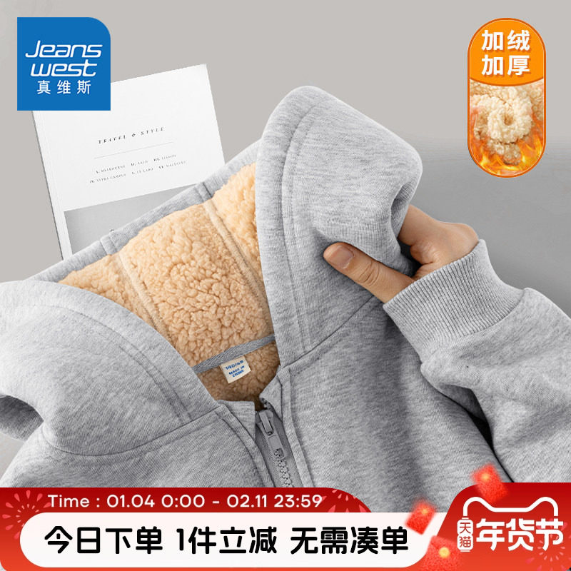 真维斯童装男童外套秋冬款儿童羊羔绒连帽卫衣开衫男孩加绒上衣秋