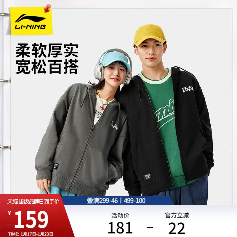 李宁外套卫衣男款秋冬保暖开衫连帽弹性吸湿透气时尚运动长袖上衣
