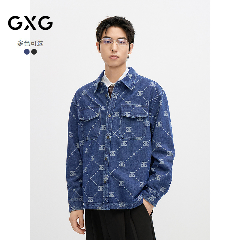 GXG男装 蓝色提花翻领牛仔长袖衬衫外套男士上衣 24年秋季品