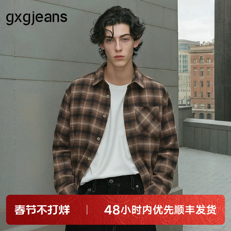 gxg.jeans男装 咖色格纹美式复古宽松长袖衬衫外套男 25年秋新品