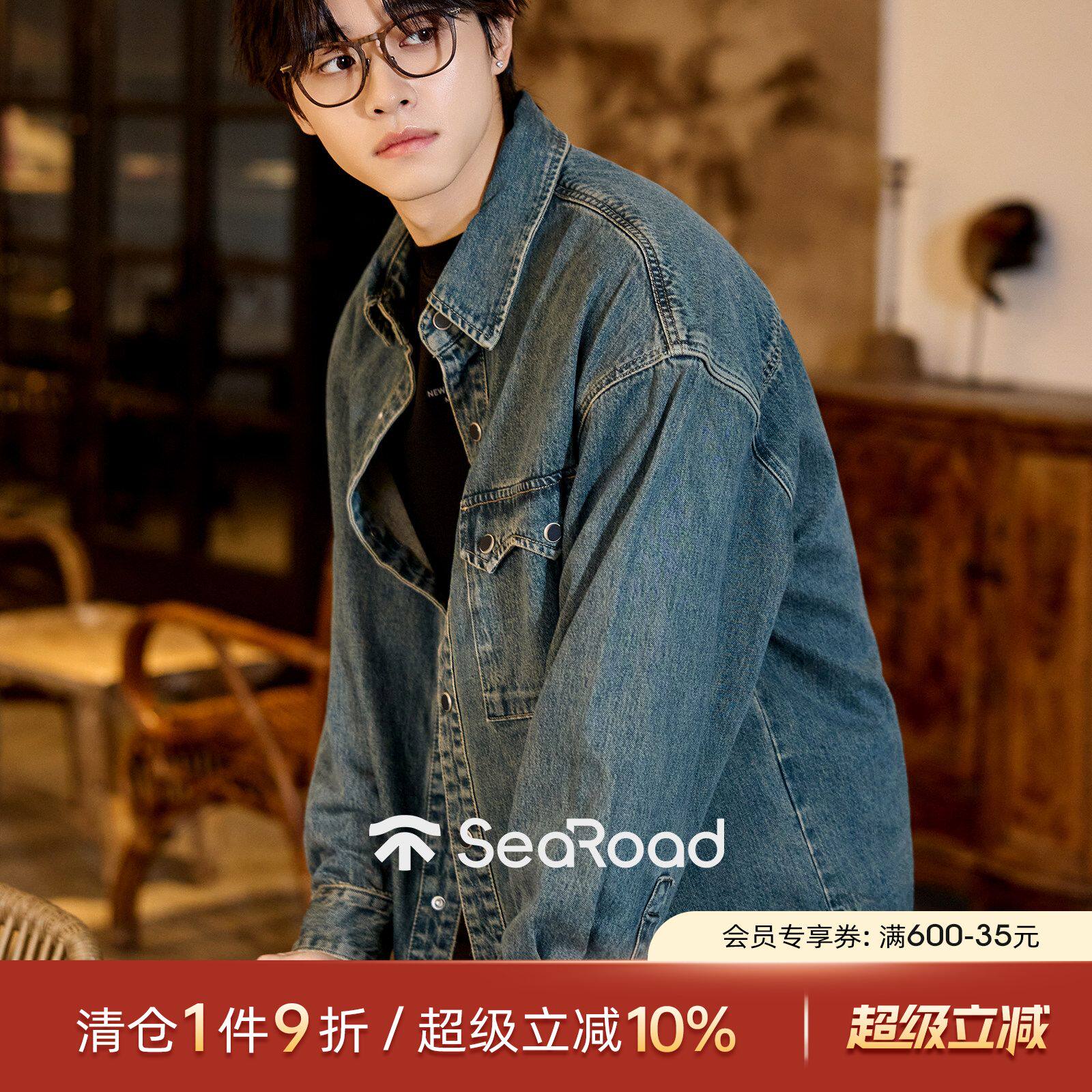 海上公路水洗复古衬衫外套男春秋宽松版简约百搭做旧长袖牛仔夹克