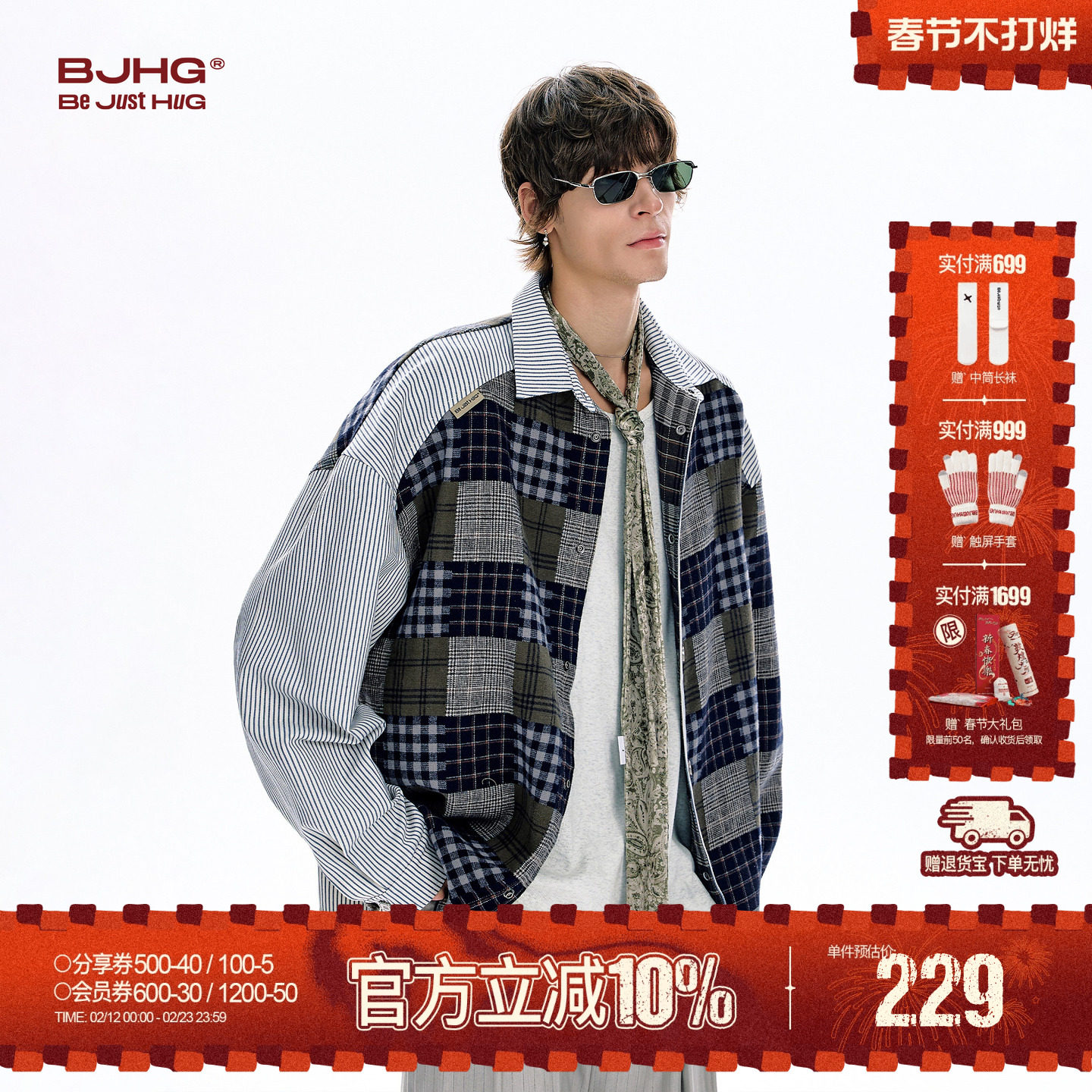 BJHG不计后果复古格子衬衫外套男款春季叠穿内搭拼接条纹翻领衬衣