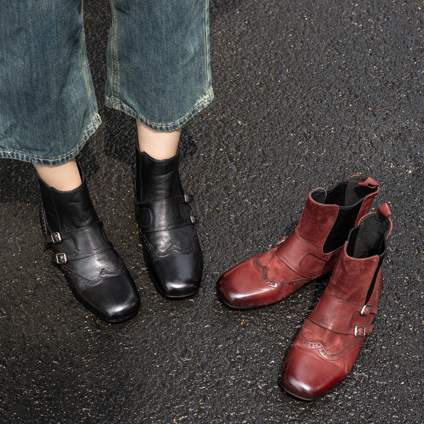 手工定制鞋全头层牛皮布洛克雕花擦色短靴女英伦风切尔西靴女靴子