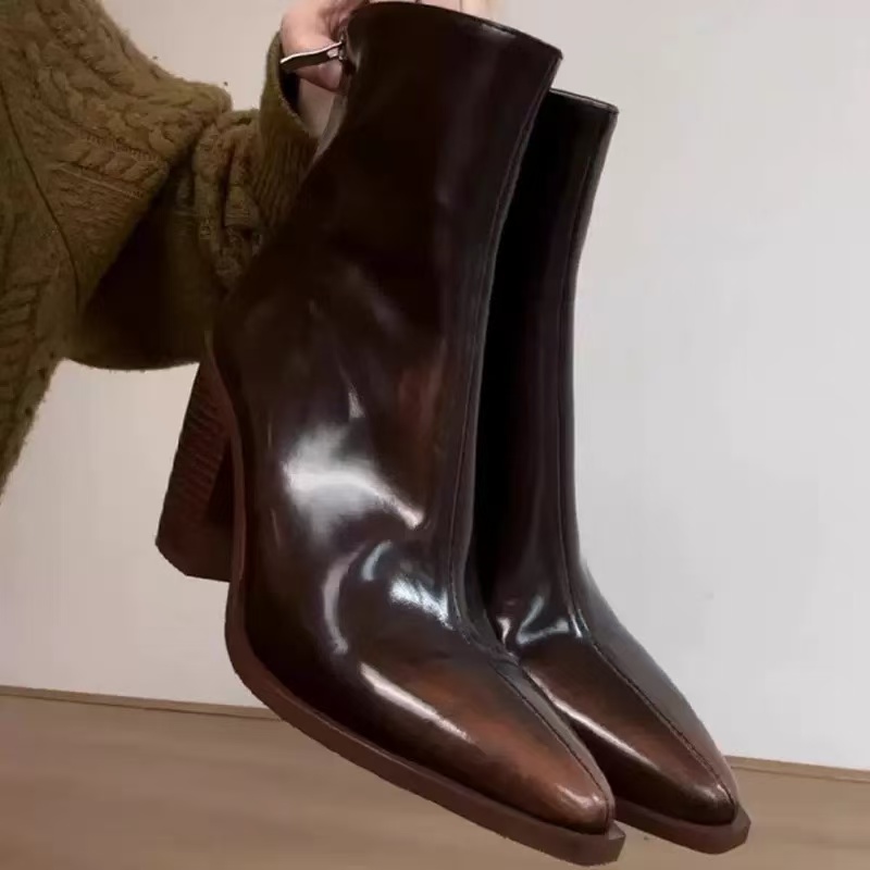 擦色短靴女2025秋冬复古高跟粗跟欧美风尖头切尔西靴后拉链瘦瘦靴