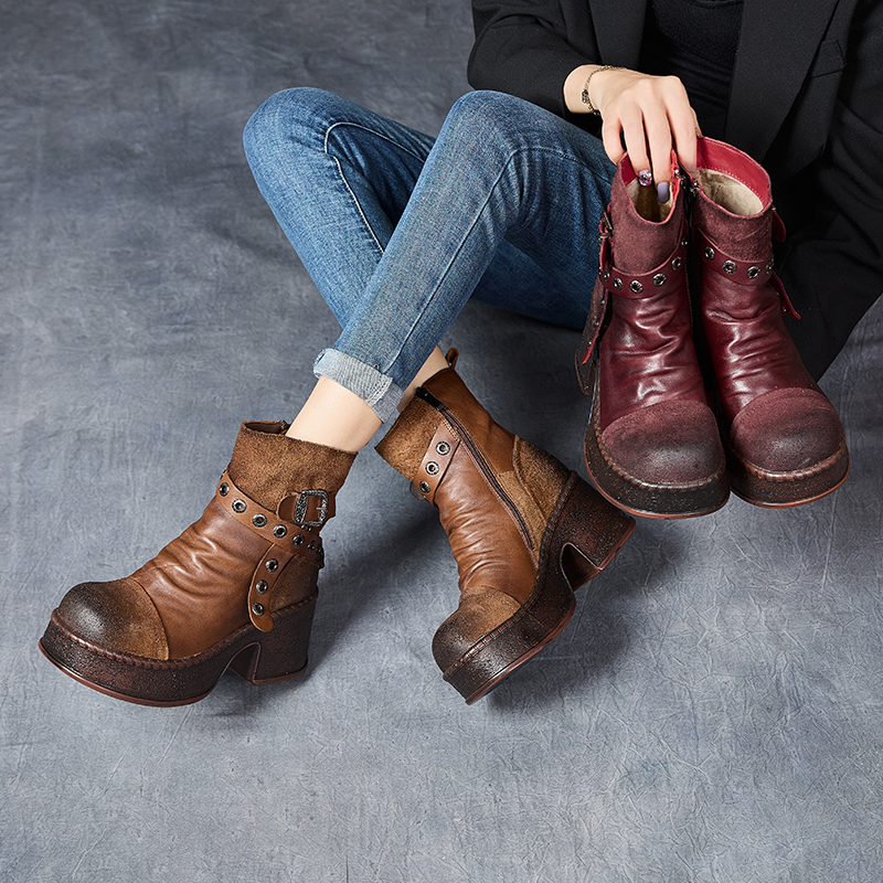 4.5cm真皮圆头粗跟擦色短靴女秋冬新款皮带扣堆堆靴厚底马丁靴子