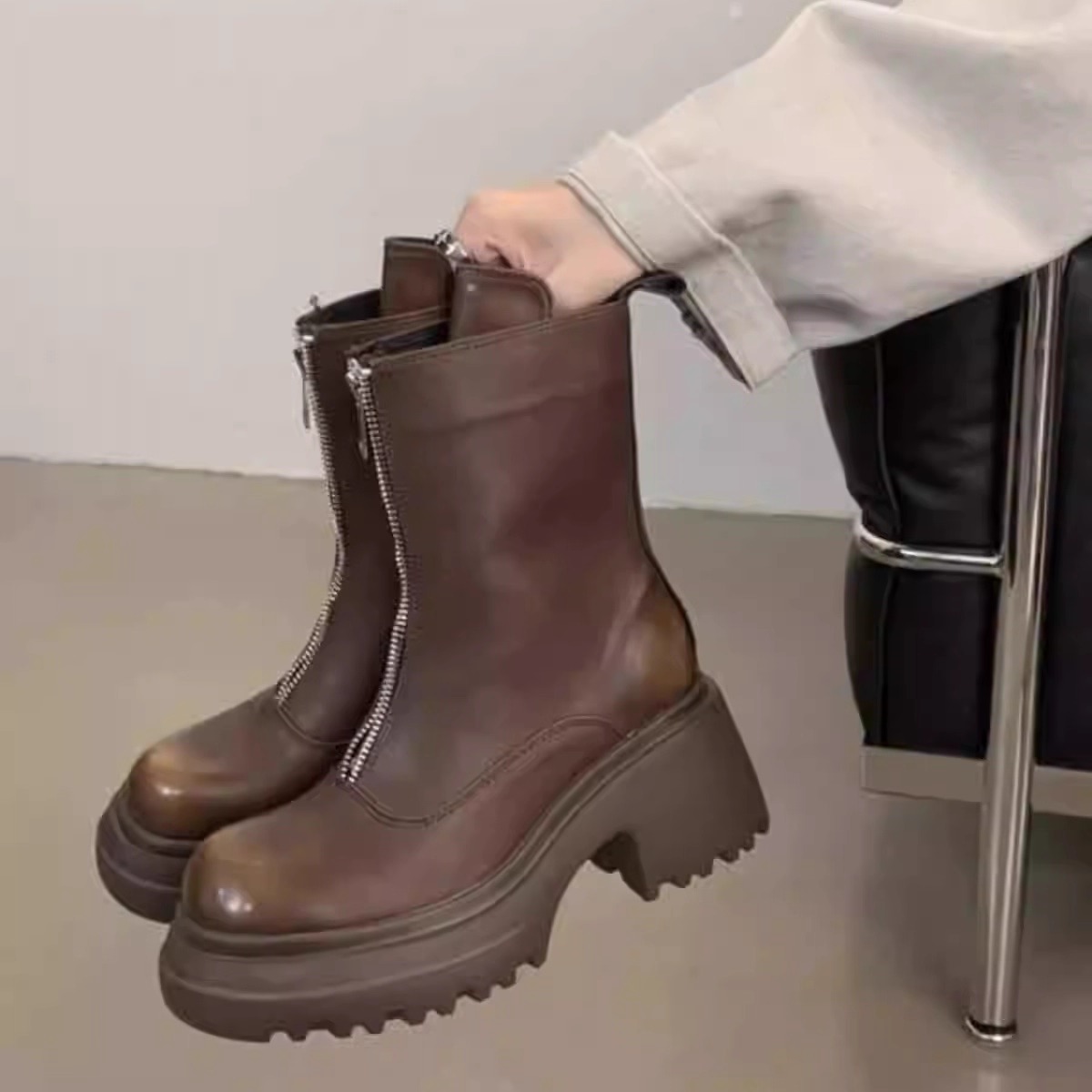 牛皮版马丁靴女2025新款增高厚底前拉链中筒靴复古擦色短靴机车靴