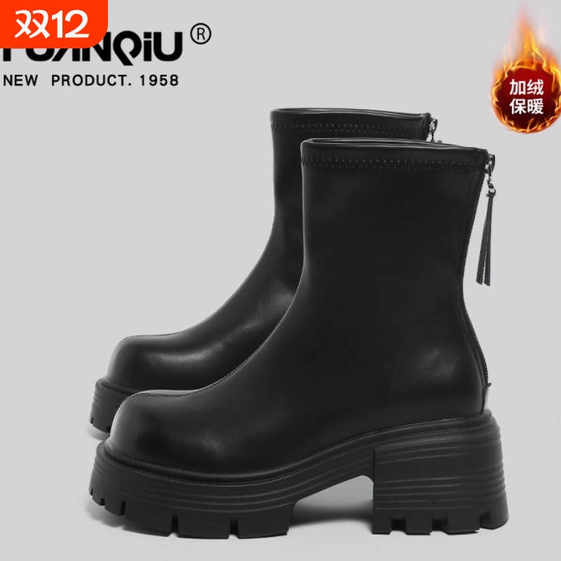 环球厚底瘦瘦靴女2025秋冬季新款加绒黑色时装靴擦色短靴子马丁靴