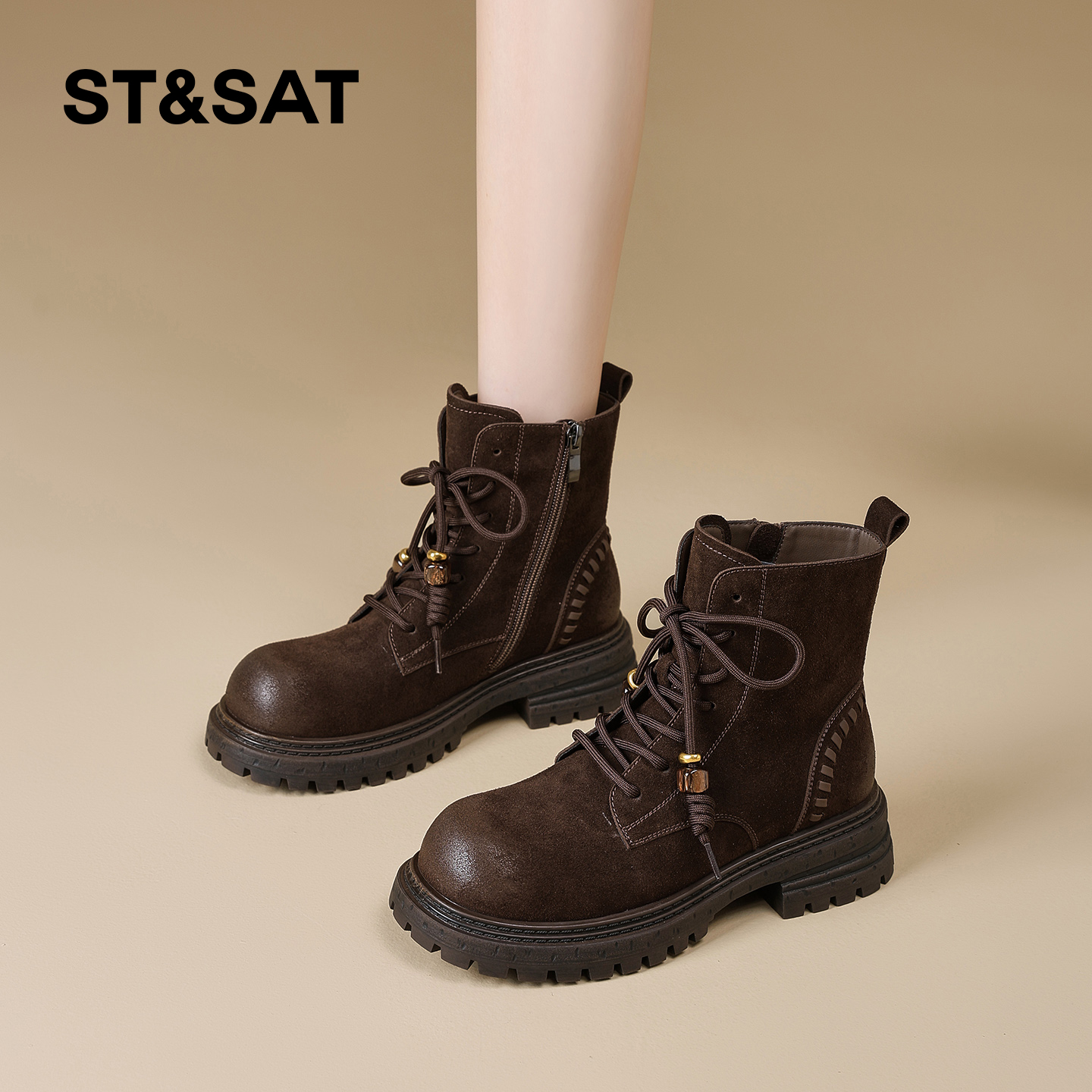 星期六复古擦色马丁靴女2025冬新款百搭英伦风串珠不累脚粗跟短靴