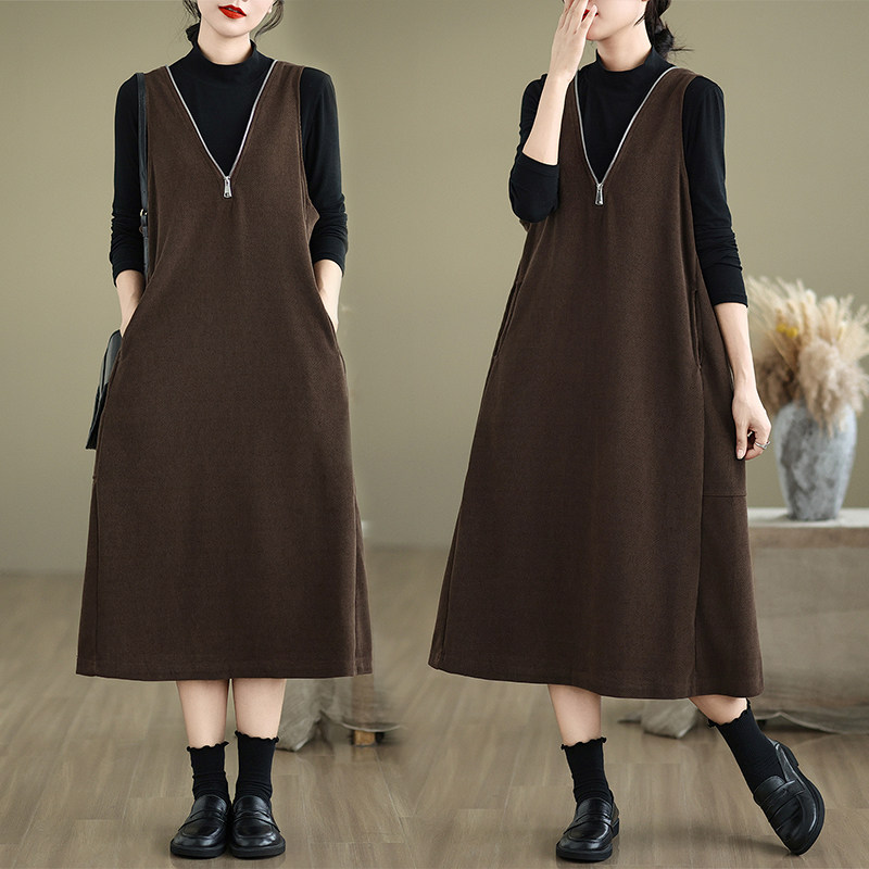 小菲家~秋冬宽松大码V领百搭中长款连衣裙女休闲女装背心裙外套