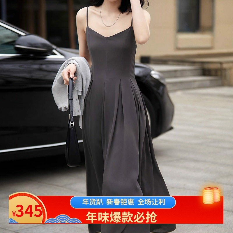 优雅高级感垂坠吊带长裙气质灰连衣裙2025秋夏款新款女装背心裙子