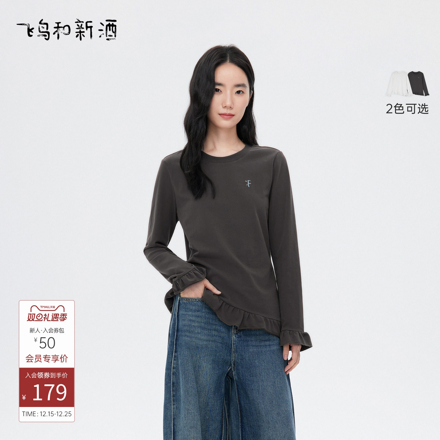 飞鸟和新酒设计感荷叶边拼接白色T恤女2025秋季新款长袖宽松上衣