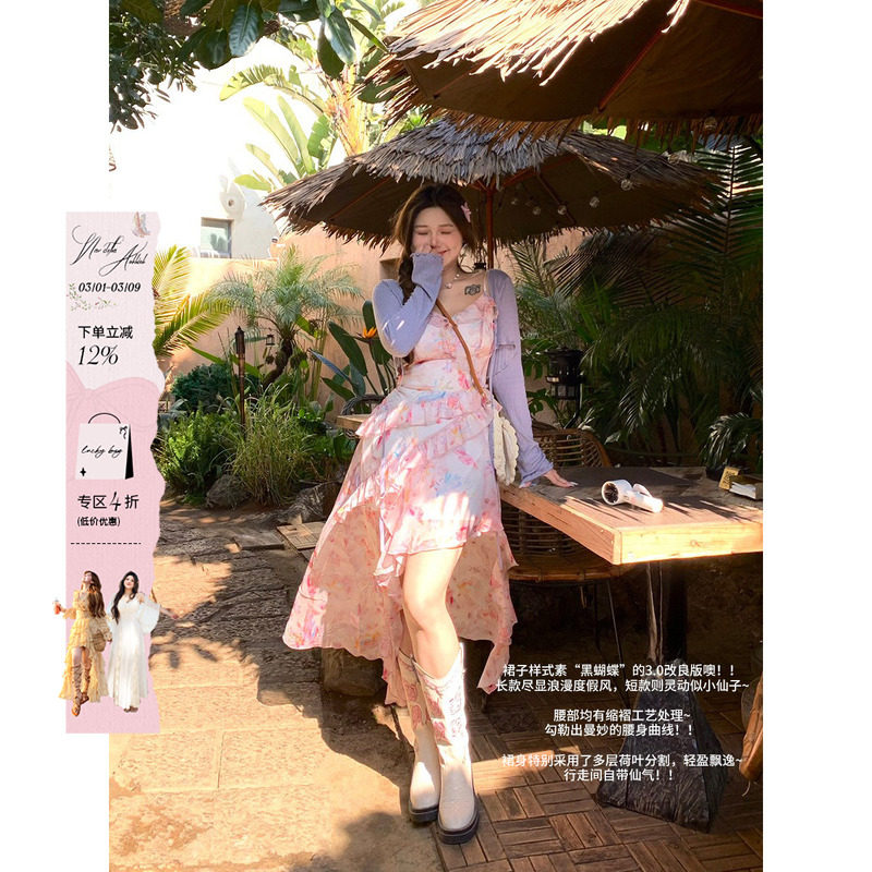 安妮不火 浪漫荷叶边雪纺短裙女2025夏季新款微胖大码渡假吊带裙
