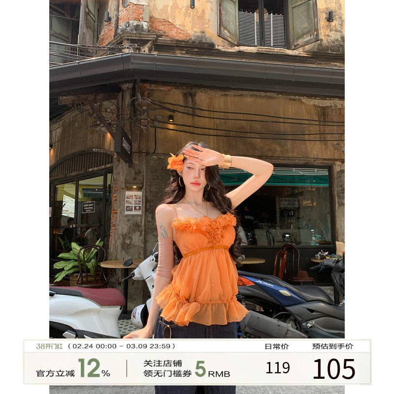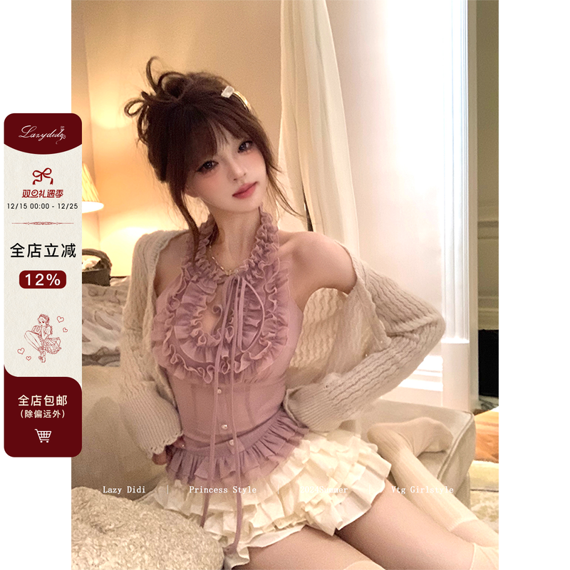 LazyDidi花瓣掉落时 荷叶边捏褶浪漫挂脖上衣纯欲风显瘦吊带打底