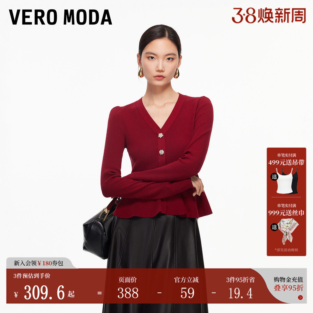 Vero Moda针织衫女2026春季新款荷叶边收腰修身红色毛衣法式优雅