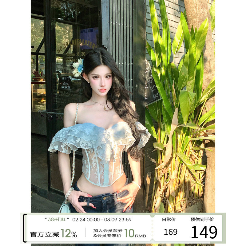 灰尘邓邓 一字肩抹胸上衣女2026早春新款荷叶边鱼骨胸衣雪纺背心