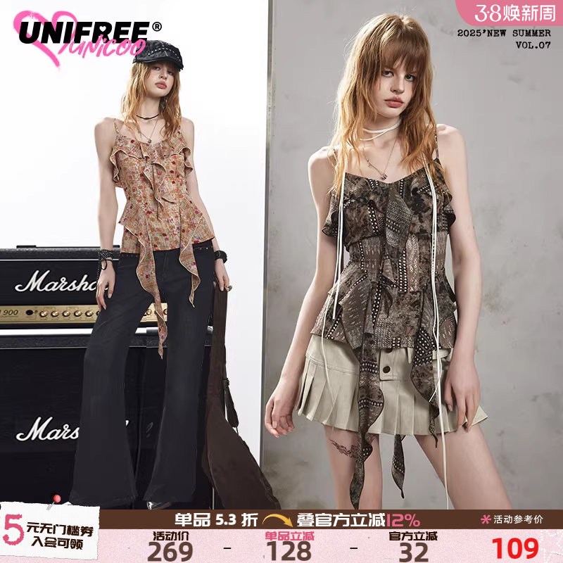 【25年夏】UNIFREE波嬉风吊带背心女荷叶边不规则设计感飘带上衣