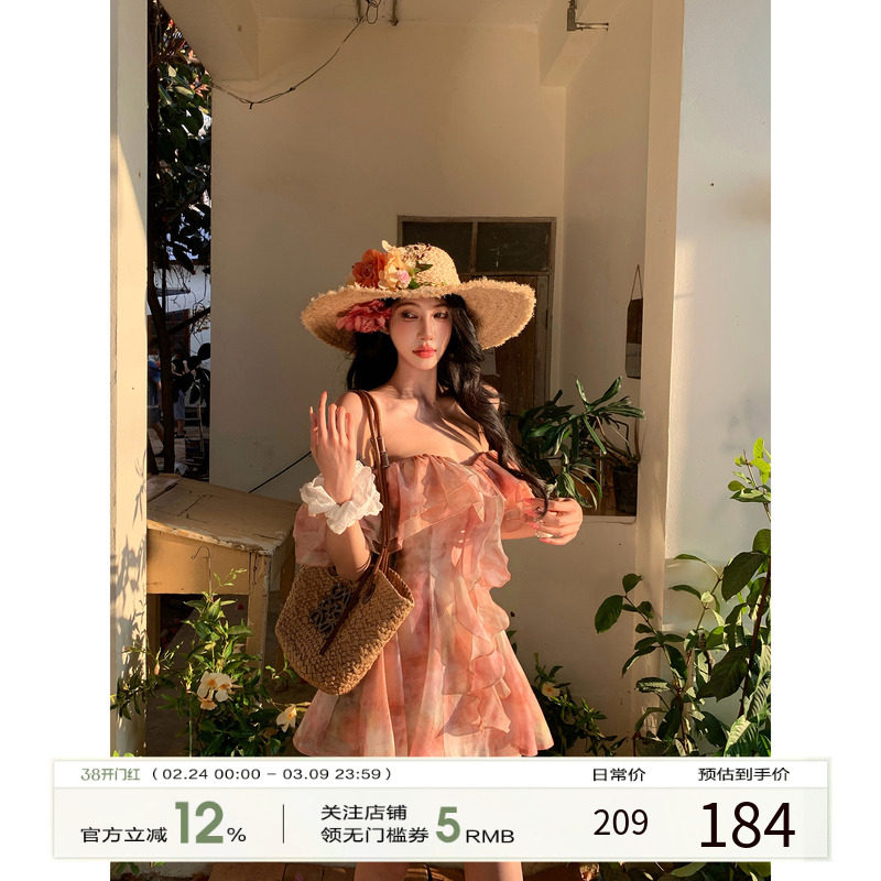 牛牛【花海】法式甜美辣妹性感荷叶边一字肩连衣裙N26Q30517