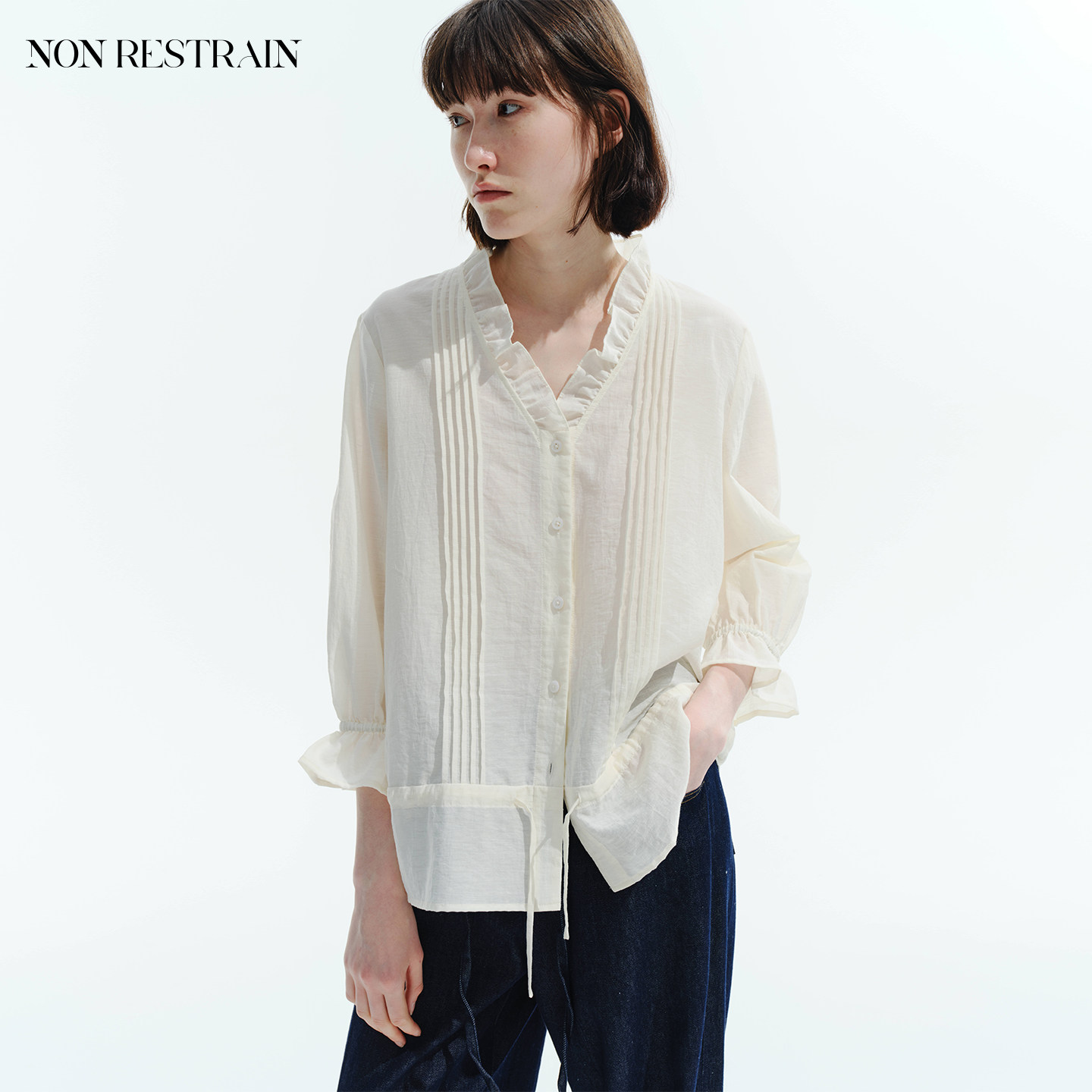 NON RESTRAIN法式荷叶边V领七分袖衬衫女通勤微透塔克褶抽绳衬衣