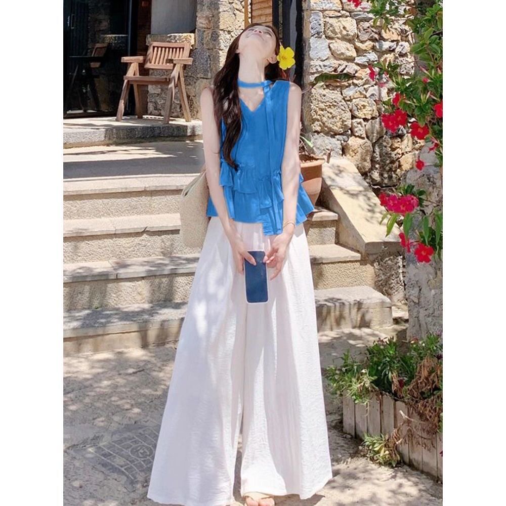 法式蓝色V领吊带背心女夏季新款海边度假绝美荷叶边拼接无袖上衣