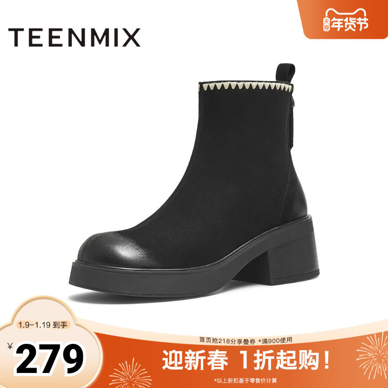 天美意方头粗跟厚底时装靴短靴女高跟鞋皮靴子2025冬新款BL991DD5