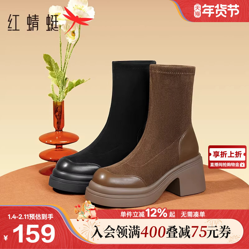 红蜻蜓复古弹力靴女秋冬新款女靴短靴粗跟厚底高跟靴子棕色瘦瘦靴