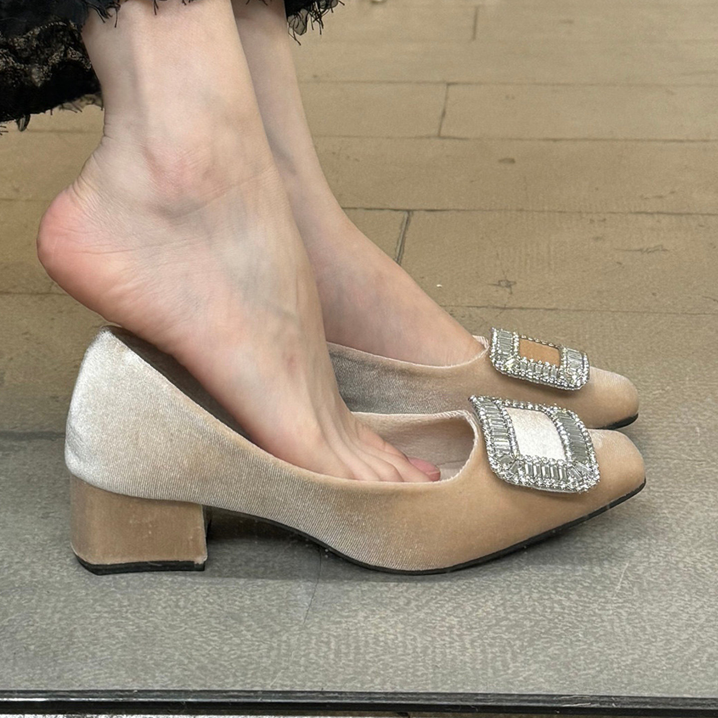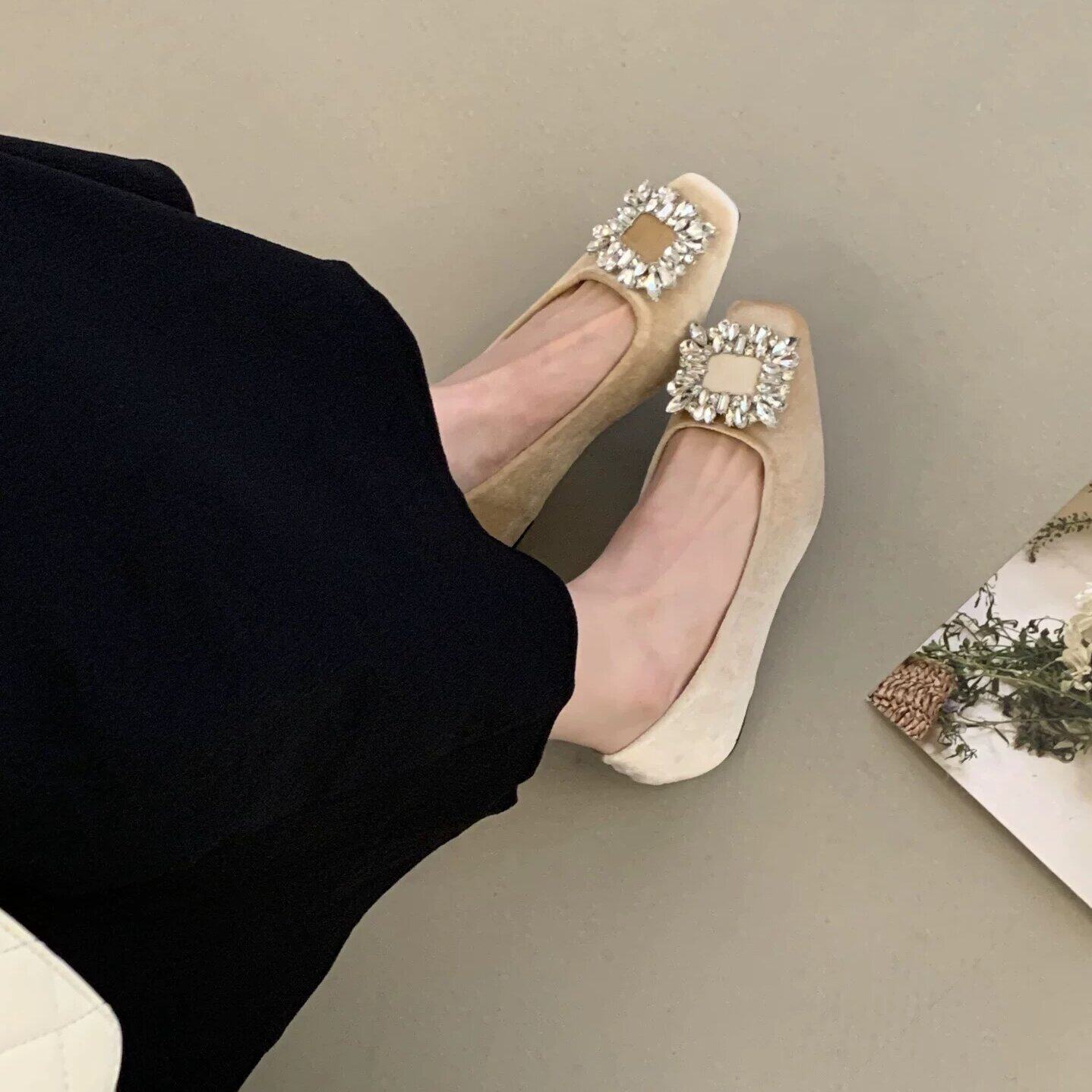 法式复古水钻方扣浅口单鞋女春秋新款粗跟一脚蹬百搭通勤芭蕾舞鞋