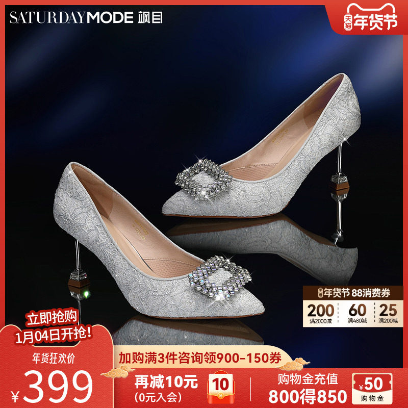 星期六优雅细高跟鞋女2026春秋新款气质晚宴婚礼水钻方扣浅口单鞋