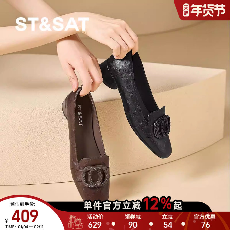 星期六2025秋季新款复古方扣浅口单鞋女粗跟老钱风不累脚通勤鞋