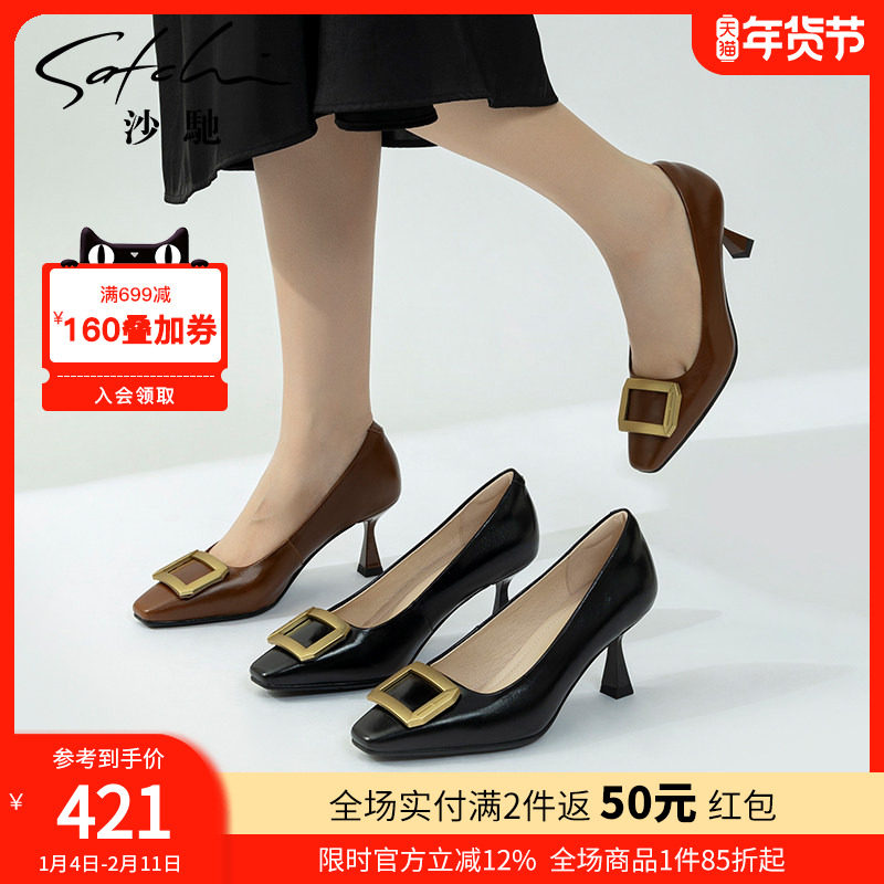 沙驰女鞋细跟高跟鞋女2025年春秋季新款职业气质时尚方扣浅口单鞋
