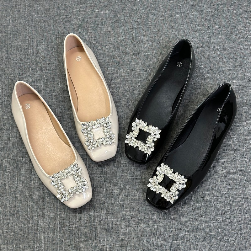 外贸撤柜法式水钻方扣浅口单鞋女平底一脚蹬软皮飘鞋晚晚风方头鞋