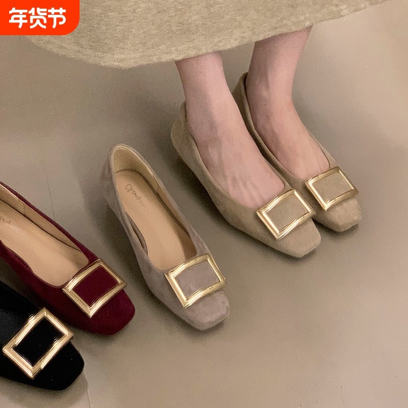 羊皮版~气质方扣浅口单鞋女2026年新款圆头绒面平底温柔甜美瓢鞋