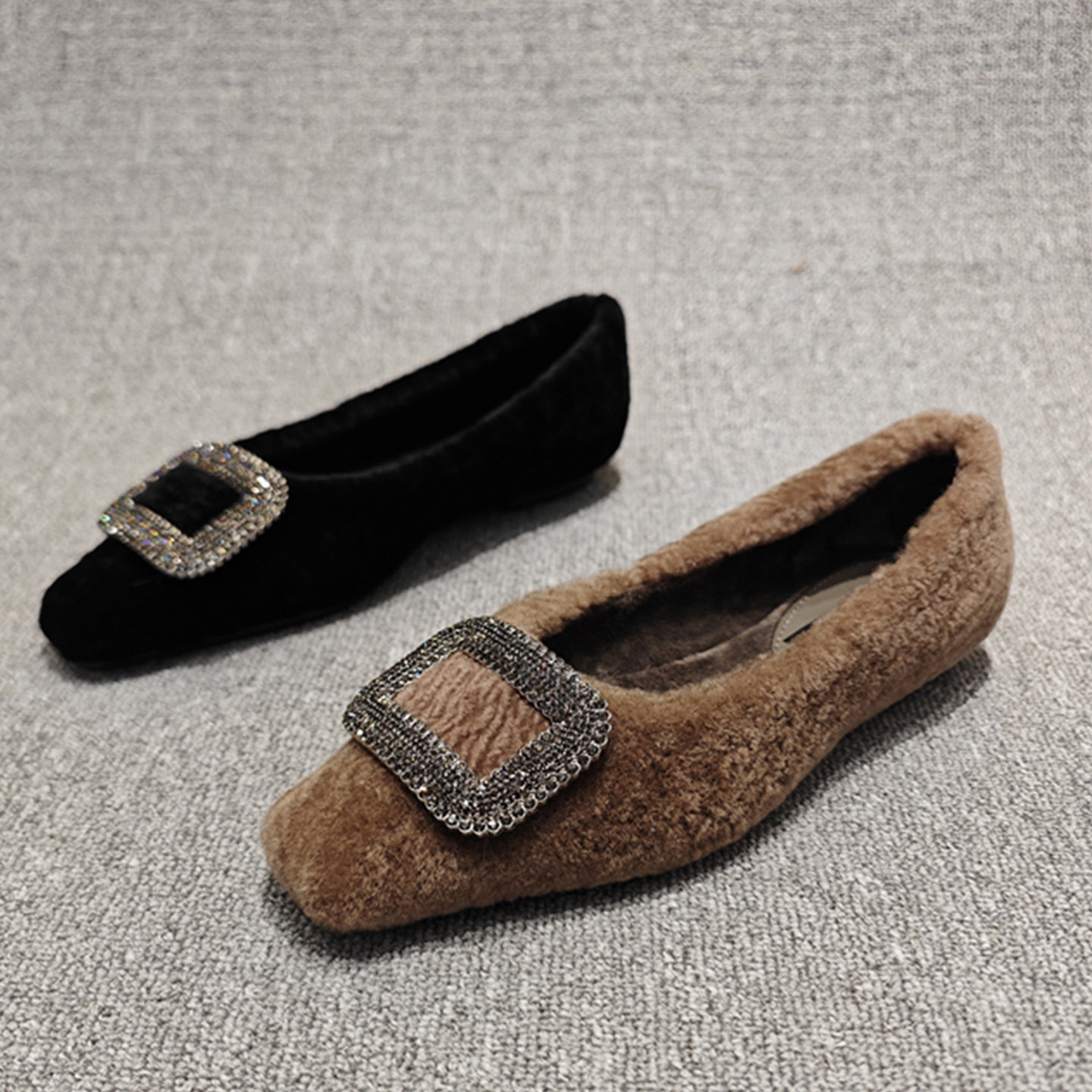 欧货版法式复古水钻方扣浅口单鞋女秋冬季加绒保暖方头平底豆豆鞋