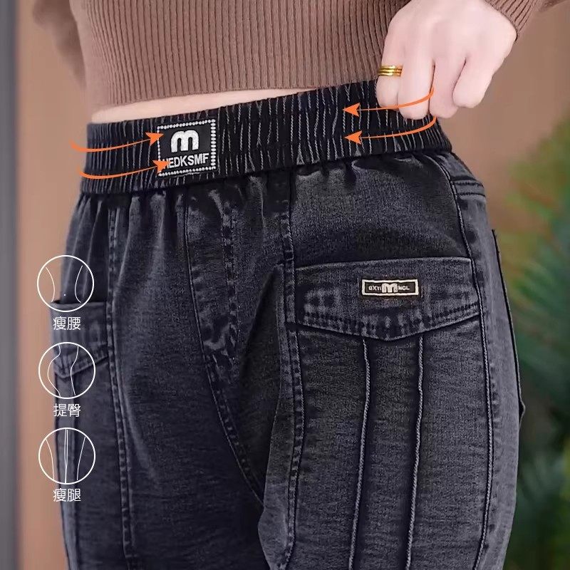 大码牛仔裤女加绒加厚松紧腰胖MM妈妈裤子显瘦弹力宽松高腰哈伦裤