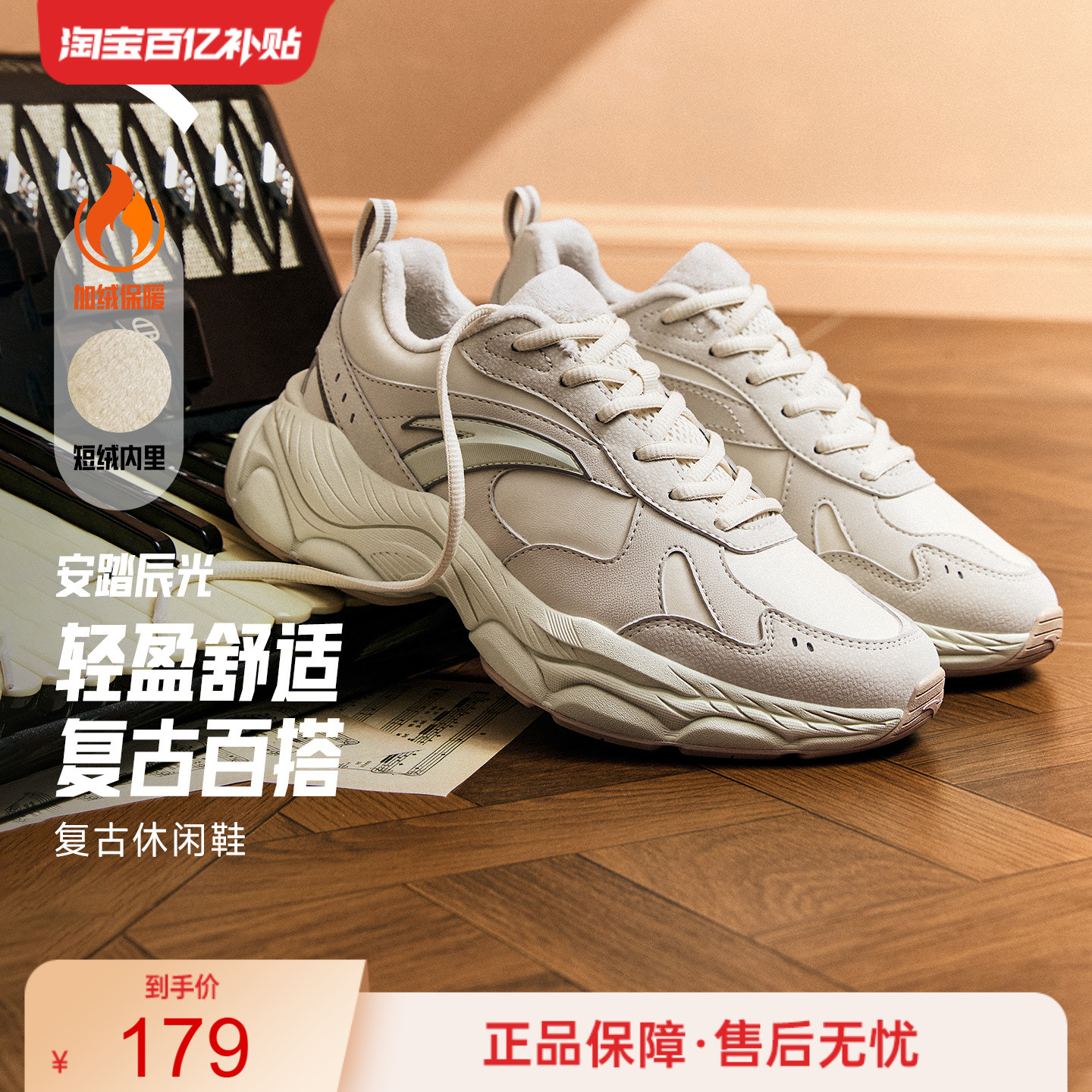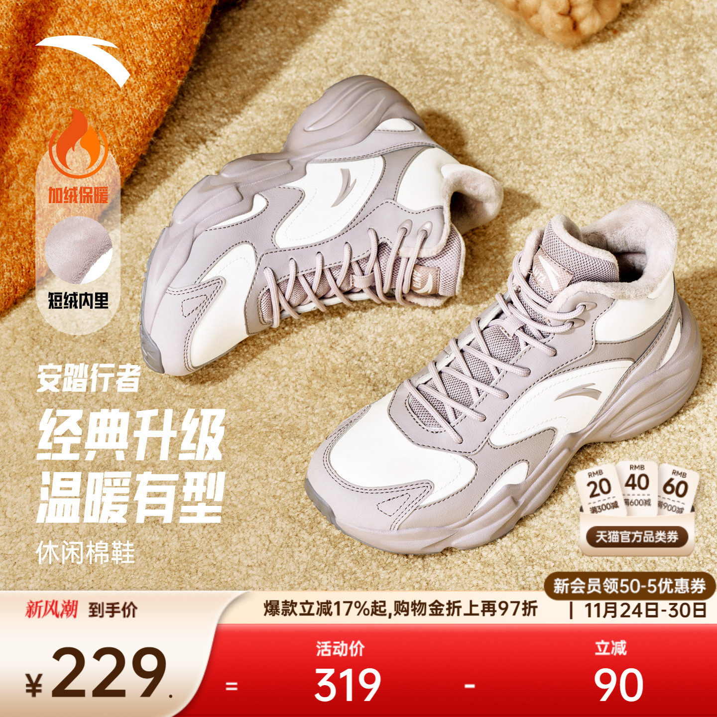 安踏星光丨厚底增高休闲鞋女鞋冬季加绒保暖运动鞋潮流百搭老爹鞋