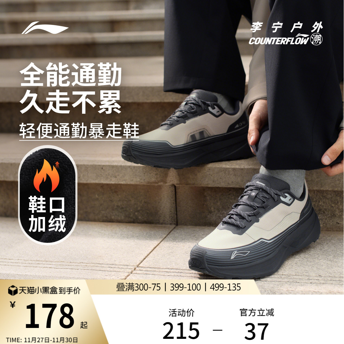李宁户外CF溯丨行际休闲鞋男女秋冬季加绒保暖减震轻便低帮通勤鞋